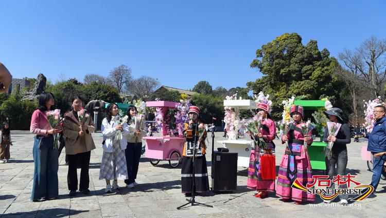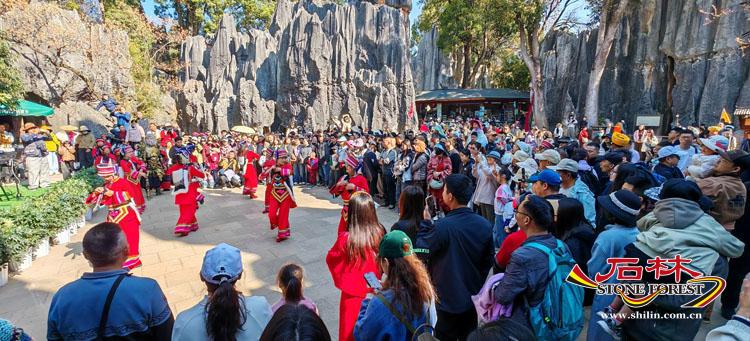 天然舞场的石间互动演出气氛热烈,游客踊跃参与、尽情狂欢。实景演出、联欢互动、动态巡演、彝文祝福书写轮番上演,阿诗玛经典对唱悠扬动听,民俗体验趣味十足。